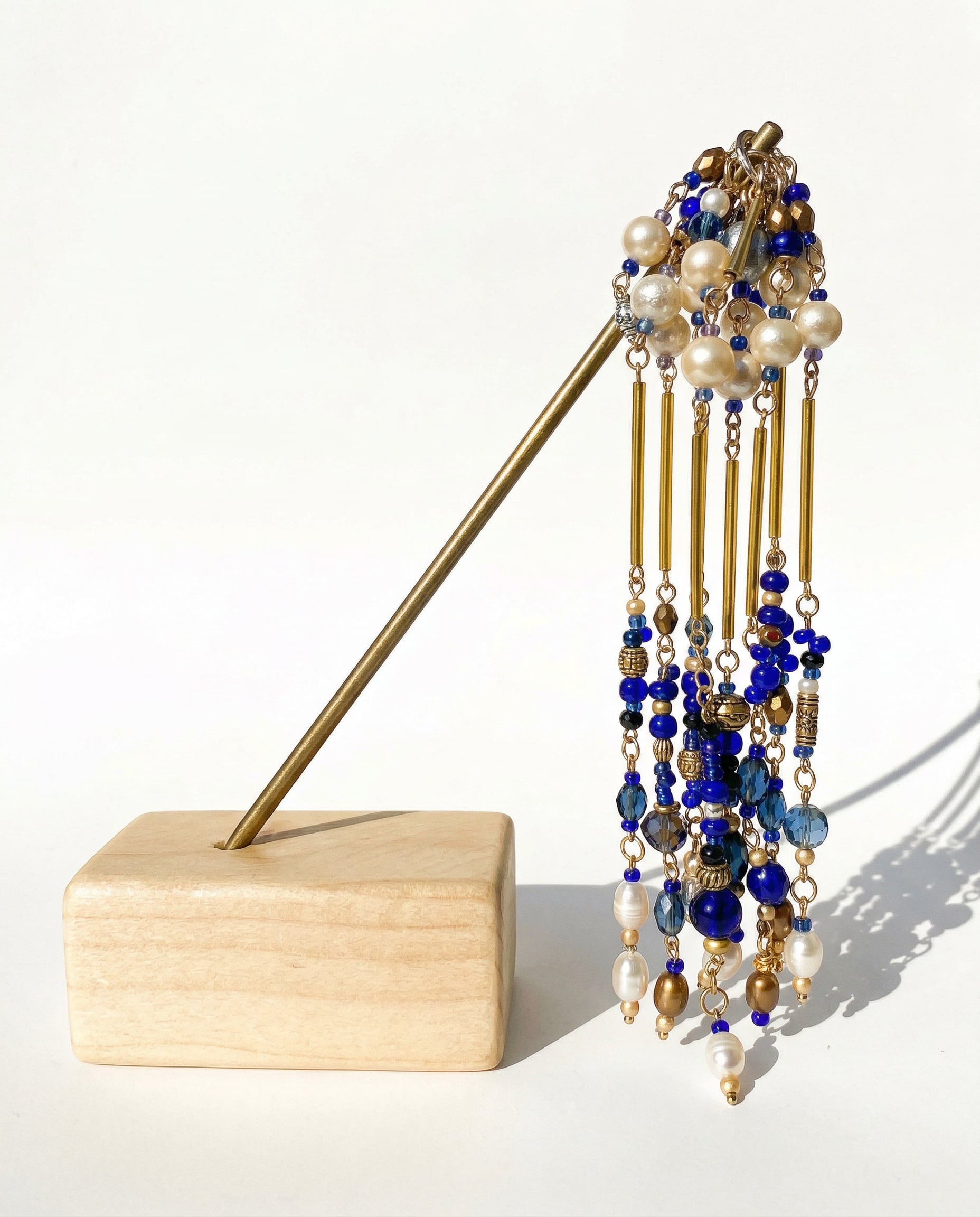 Glass, brass, cotton pearl, glass pearl