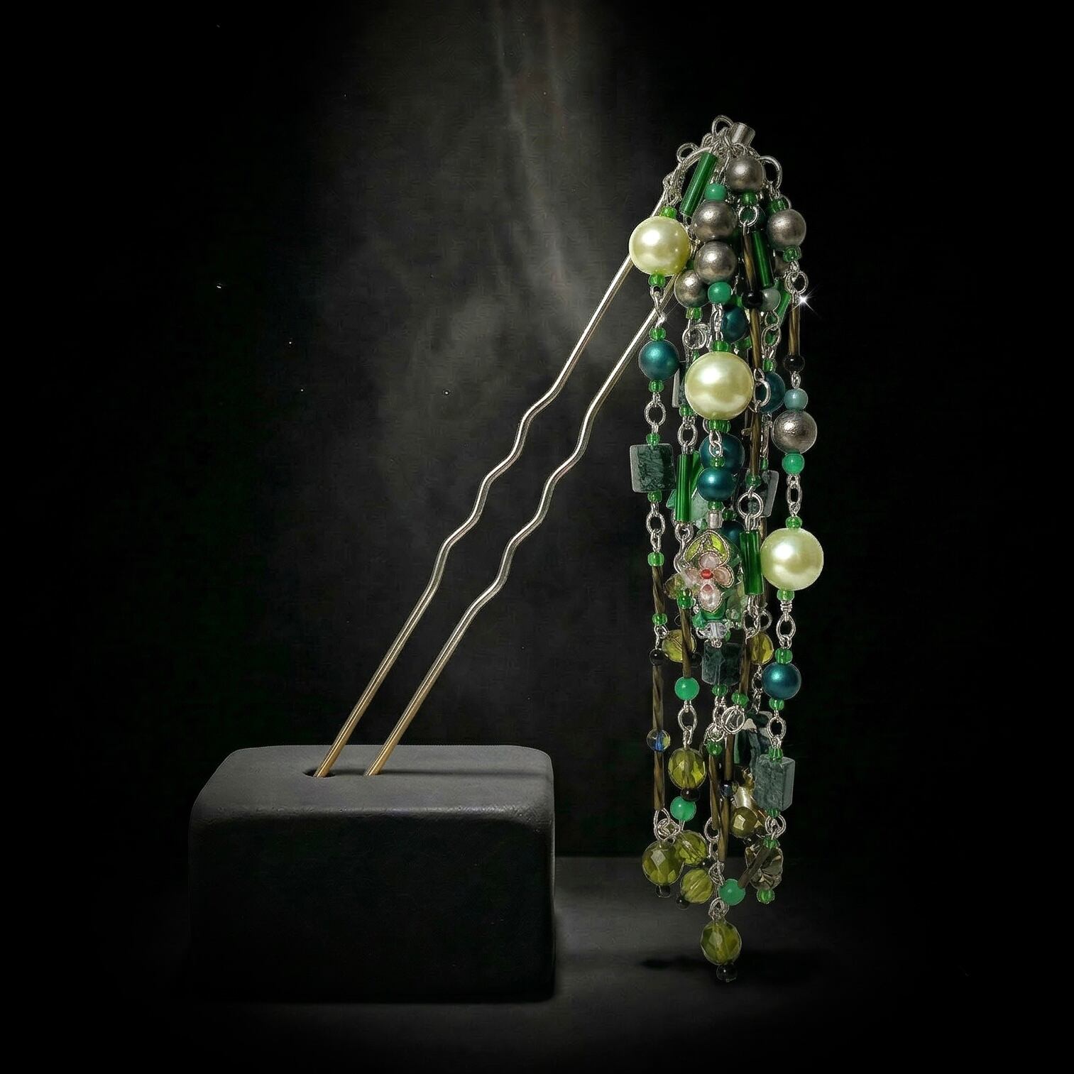 Glass, brass, cotton pearl, glass pearl